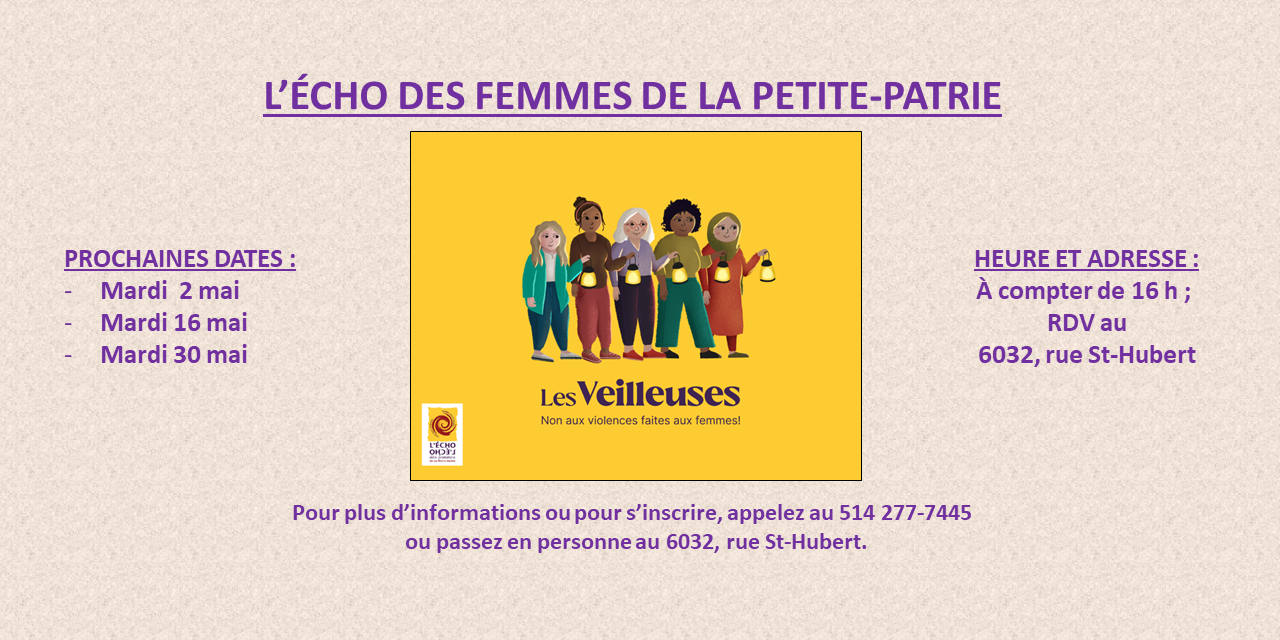 C’est avec solidarité que nous vous partageons une invitation de L’Écho des femmes de La Petite-Patrie, dans le cadre de leur projet : Les Veilleuses ; Non aux violences faites aux femmes !