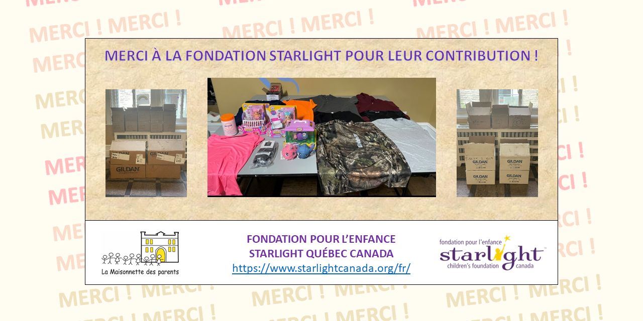 Un grand MERCI à La Fondation pour l’enfance Starlight Québec Canada de leur implication sociale ainsi que pour leur générosité envers notre organisme et nos familles ! 🙂