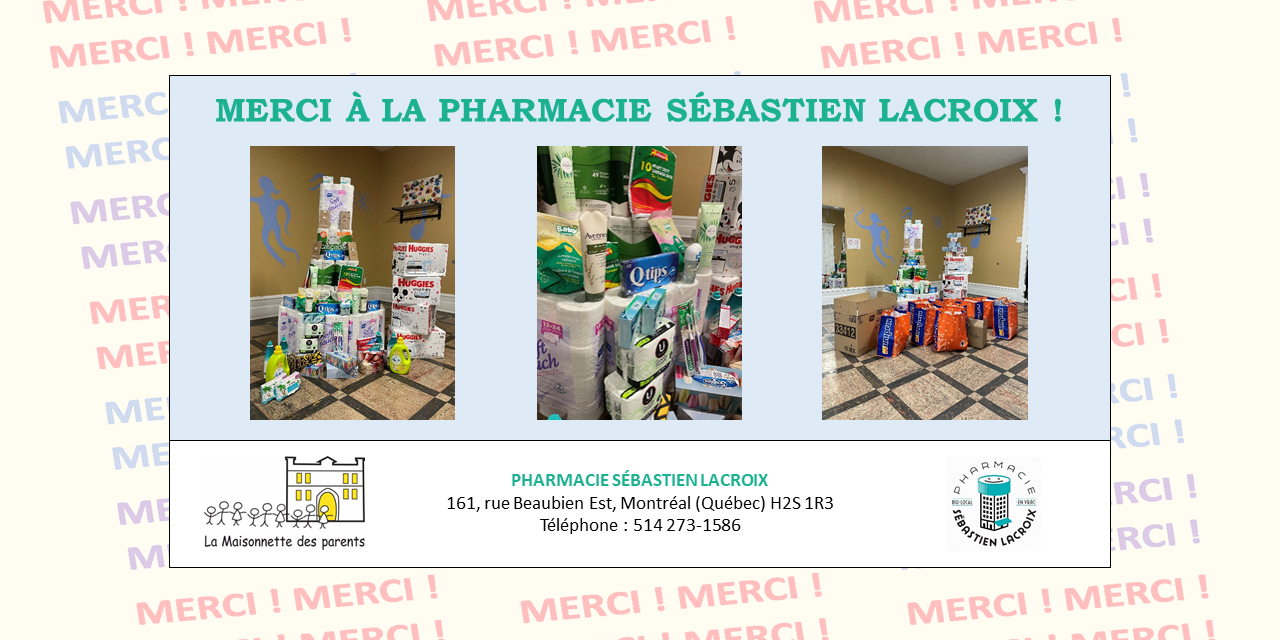 Il nous fait grandement plaisir de vous annoncer que la Pharmacie Sébastien Lacroix, située dans notre quartier au 161, rue Beaubien Est à Montréal, s’est impliquée encore cette année dans sa communauté en redonnant aux familles de notre arrondissement. 🙂
