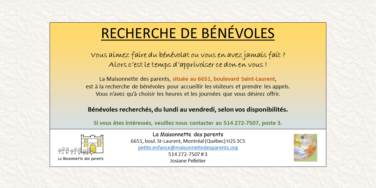 Nous sommes à la recherche de bénévoles pour l’accueil, à la réception, de 9 h à 13 h, de 13 h à 17 h, ou toute la journée, et ce, du lundi au vendredi, selon vos disponibilités. 🙂