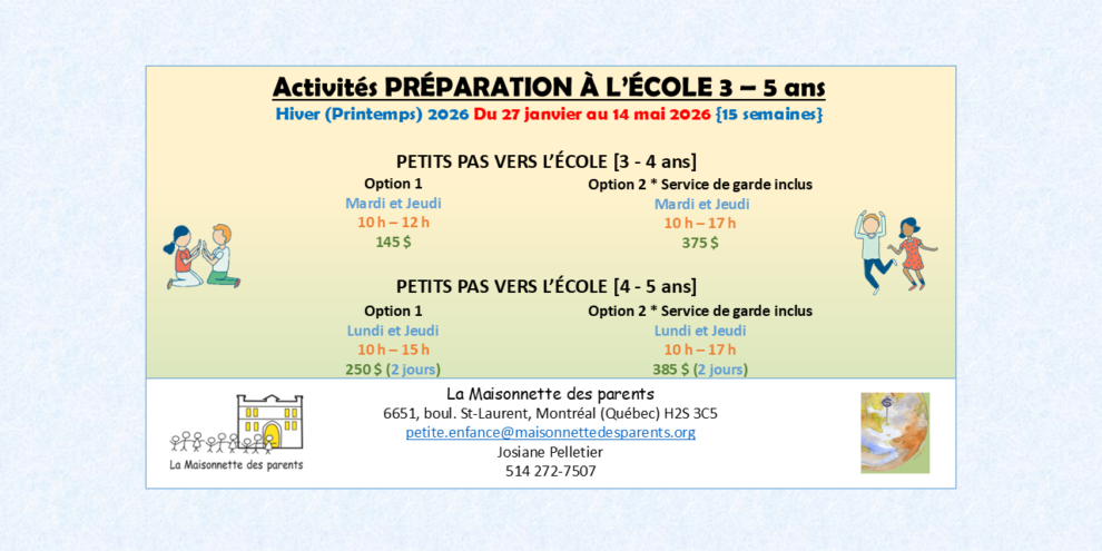 Nous avons le plaisir de vous rappeler que notre programme « Petits pas vers l’école 3-5 ans » et l’activité « Parents-enfants s’amusent 18 mois-3 ans » sont de retour pour notre Session Hiver (Printemps) 2026. 🙂 Ladite session est de 15 semaines, soit du 27 janvier au 14 mai 2026. Les inscriptions sont en cours via…