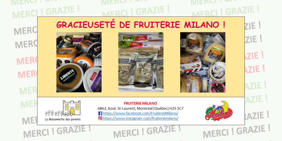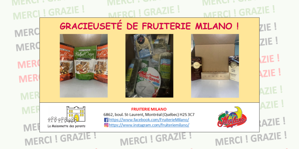 Voici un aperçu des dons alimentaires reçus des dernières semaines de Fruiterie Milano. 🙂 Au nom de La Maisonnette des parents et nos familles, GRAZIE !