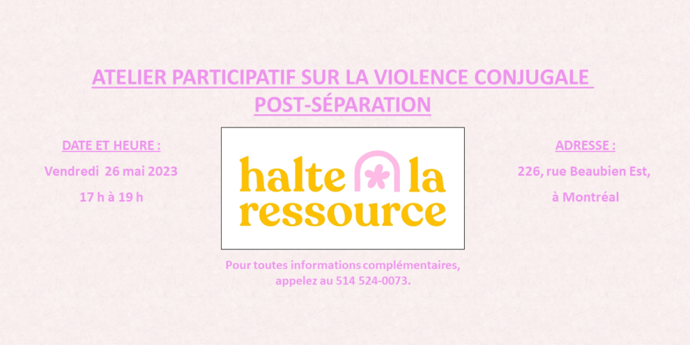La Maisonnette des parents tient à partager une invitation de l’organisme Halte la Ressource, dans le cadre de leur atelier participatif sur la violence conjugale post-séparation. L’atelier s’adresse aux mères monoparentales ou en processus de séparation. La rencontre se tiendra en personne le vendredi 26 mai prochain, de 17 h à 19 h, à Halte…