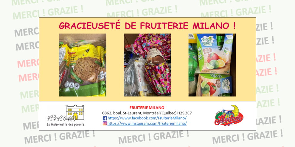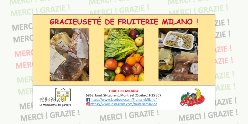 Voici un aperçu des dons alimentaires reçus cette semaine de Fruiterie Milano 🙂 Au nom de La Maisonnette des parents et nos familles, GRAZIE !