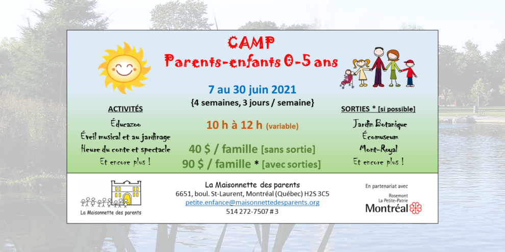 INSCRIPTIONS EN LIGNE VIA LA PLATEFORME AMILIA OU PAR TÉLÉPHONE À PARTIR DU LUNDI 26 AVRIL À 12 H (MIDI). Du 7 au 30 juin 2021 {4 semaines} Lundi, mardi et jeudi de 10 h à 12 h * (peut varier selon l’activité ou la sortie) Nous proposons une variété d’activités ludo-éducatives pour les familles…