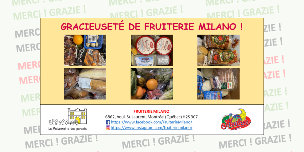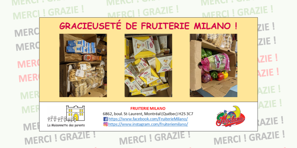 Voici un aperçu des dons alimentaires reçus cette semaine, et la semaine dernière, de Fruiterie Milano 🙂 Au nom de La Maisonnette des parents et nos familles, GRAZIE !