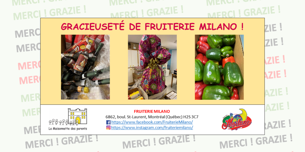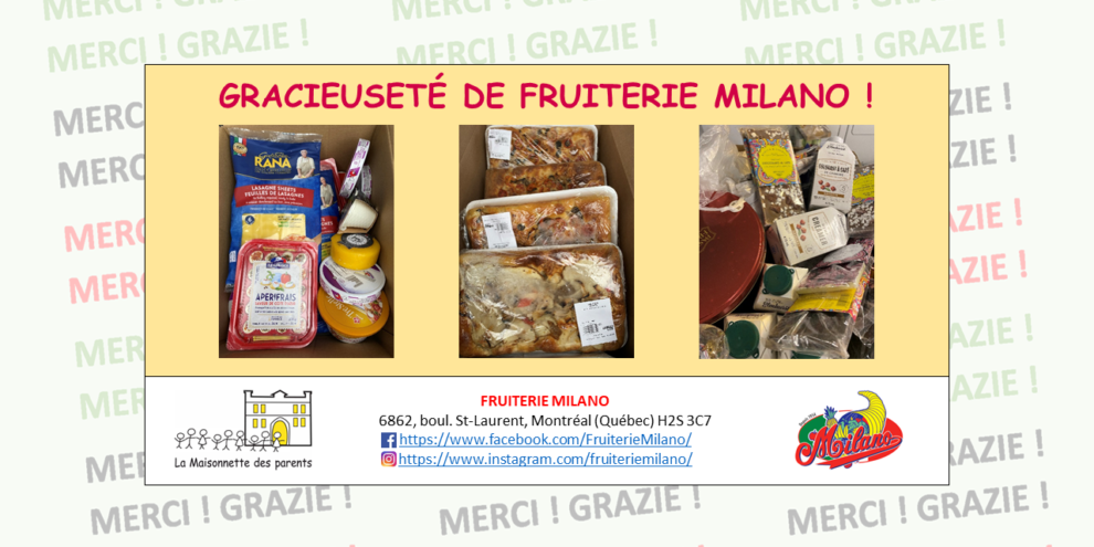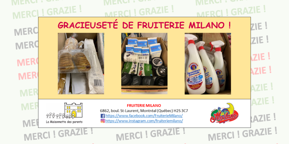 Voici un aperçu des dons alimentaires reçus cette semaine de Fruiterie Milano 🙂 Au nom de La Maisonnette des parents et nos familles, GRAZIE !