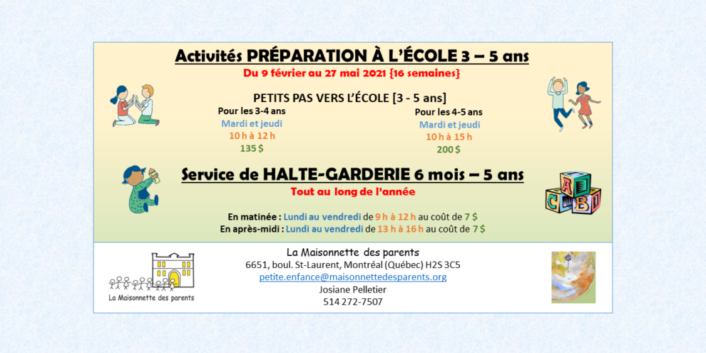 Nous avons le plaisir de vous informer que notre programme « Petits pas vers l’école 3-5 ans » est officiellement de retour pour une session de 16 semaines, soit du 9 février au 27 mai 2021. 🙂 La programmation révisée propose l’horaire suivant pour les 3-4 ans : mardi et jeudi de 10 h à 12…