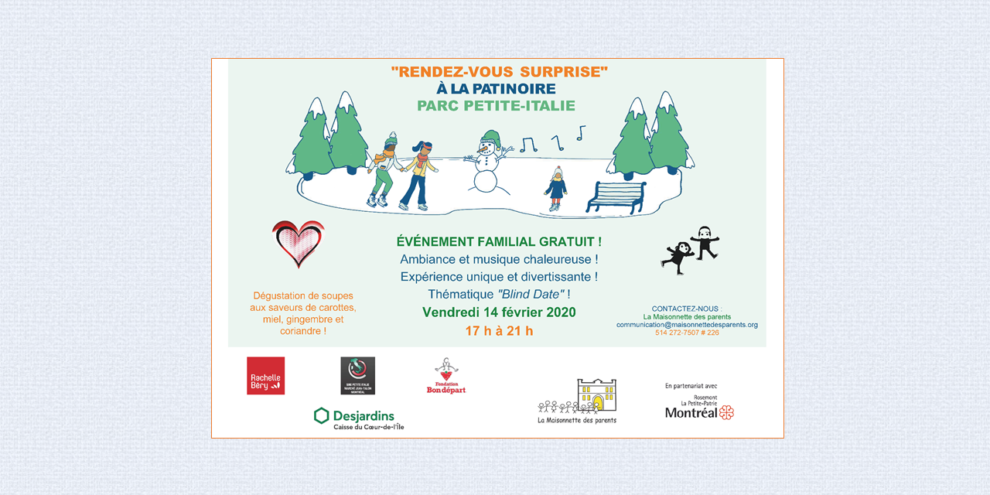 NOTRE ÉVÉNEMENT FAMILIAL GRATUIT « RENDEZ-VOUS SURPRISE » A LIEU DEMAIN ! VENEZ CÉLÉBRER LA SAINT-VALENTIN AVEC NOUS 🙂 Rendez-vous demain, le vendredi 14 février de 17 h à 21 h, en face de notre organisme (6651, boul. St-Laurent), à la patinoire du parc Petite-Italie ! Au plaisir de vous y voir 🙂 La Maisonnette des parents…