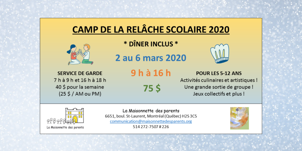 La période d’inscription est amorcée ! Profitez-en pour réserver votre place ! Programmation complète et inscriptions en ligne ici : Boutique en lignepowered by Amilia.com La semaine de relâche arrive à grands pas et La Maisonnette des parents vous propose son fameux camp de jour pour vos enfants âgés de 5 à 12 ans…
