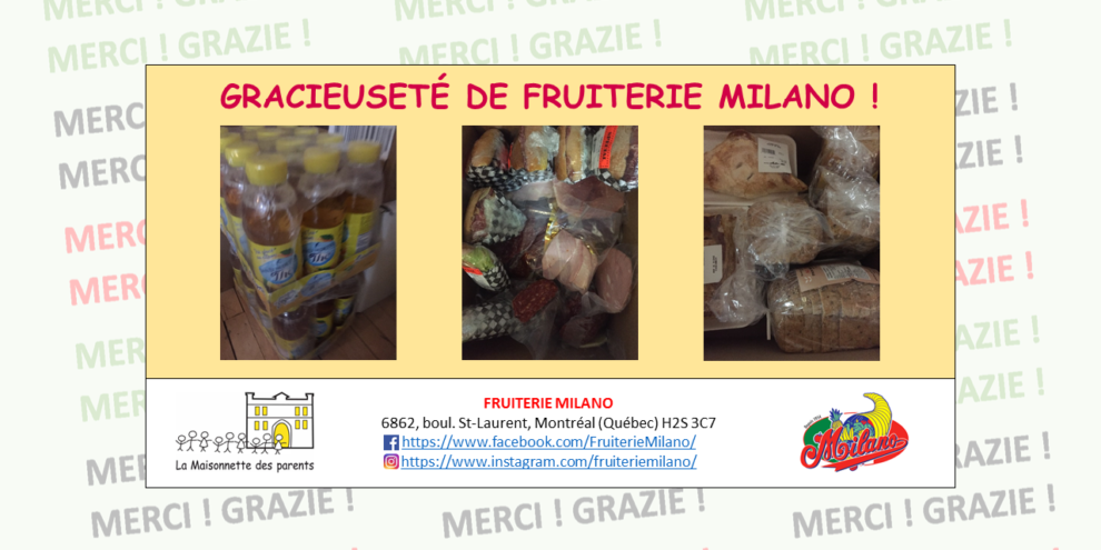 Voici un aperçu des dons alimentaires reçus cette semaine de Fruiterie Milano 🙂 Au nom de La Maisonnette des parents et nos familles, GRAZIE !