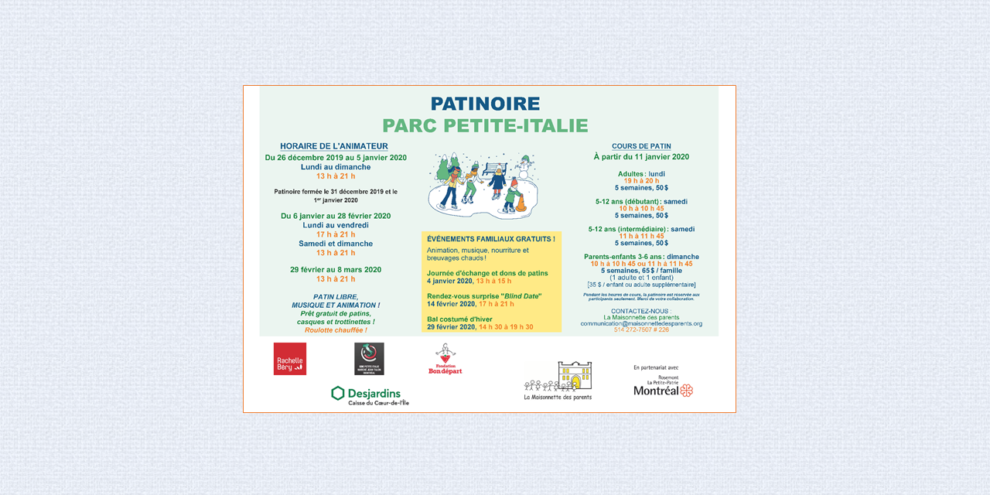 La période d’inscription est amorcée ! Profitez-en pour réserver vos activités de patinage ! Programmation complète et inscriptions en ligne ici : Boutique en lignepowered by Amilia.com Venez profiter de la magnifique patinoire du parc Petite-Italie située sur le boulevard Saint-Laurent (coin Saint-Zotique), directement en face de La Maisonnette des parents ! Voici un…