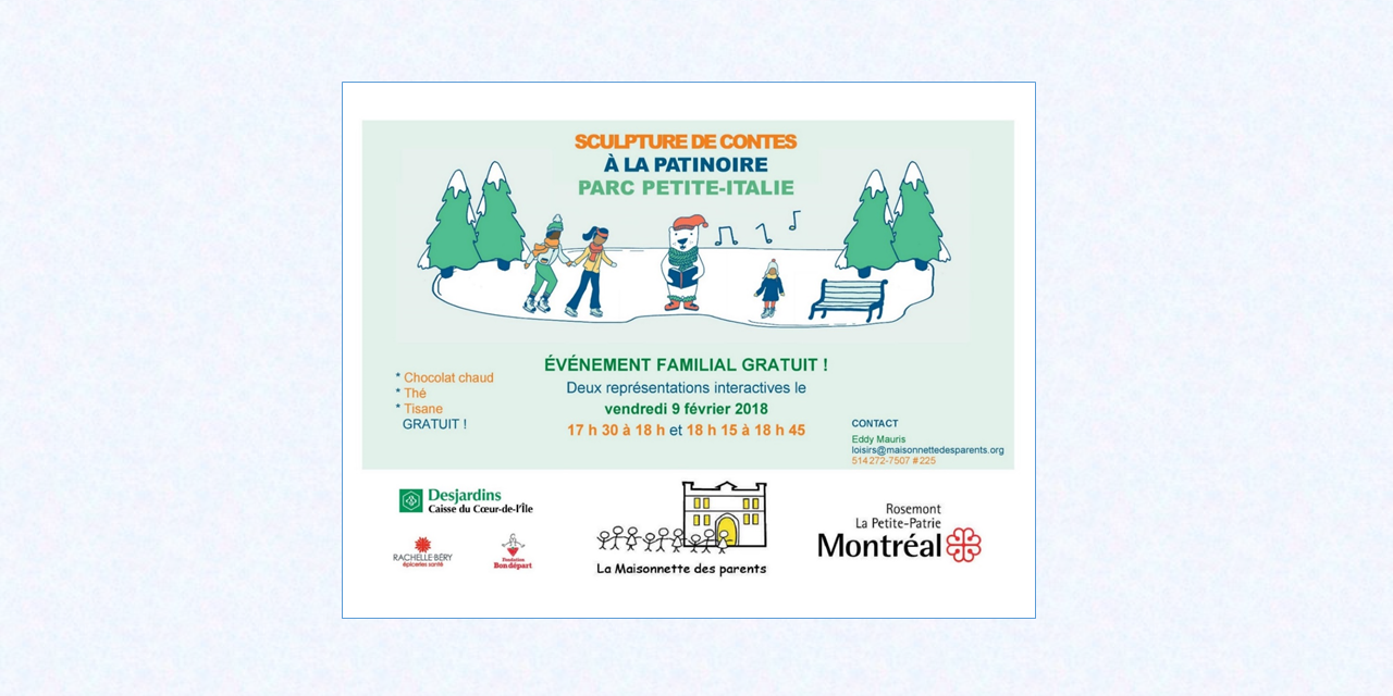 La Maisonnette des parents a le plaisir d’annoncer un événement gratuit qui se déroulera à la patinoire du Parc Petite-Italie intitulé Sculpture de contes.