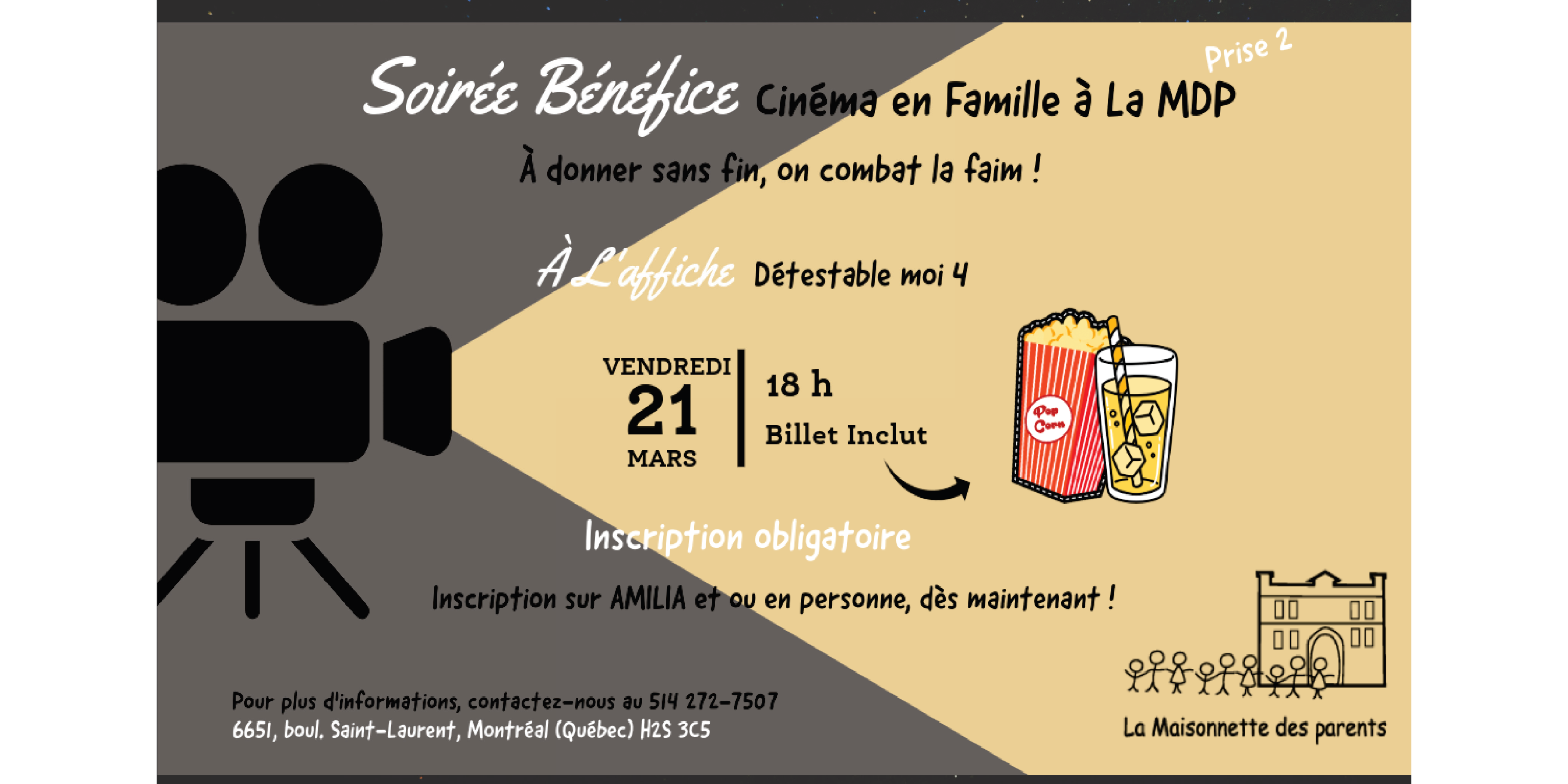C’est avec beaucoup d’enthousiasme que La Maisonnette des parents annonce une 2e édition de sa Soirée bénéfice – Cinéma en famille à La MDP ! 🙂 C’est donc un rendez-vous dans nos locaux, le vendredi 21 mars prochain, à 18 h !