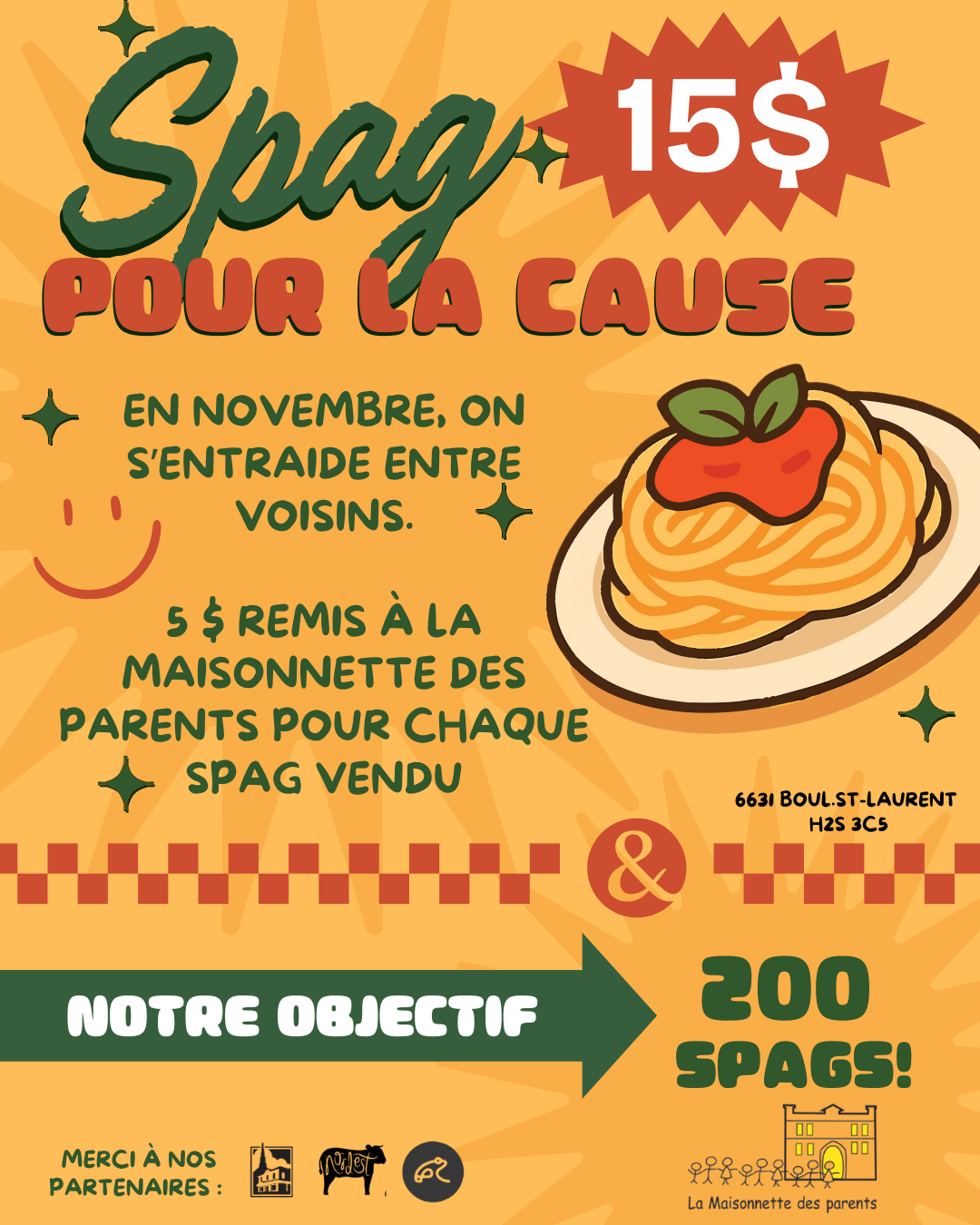 Durant le mois de novembre, pour chaque plat de spaghetti vendu : « Spag pour la cause » ; un don de 5 $ sera remis à notre organisme communautaire Famille. 🙂